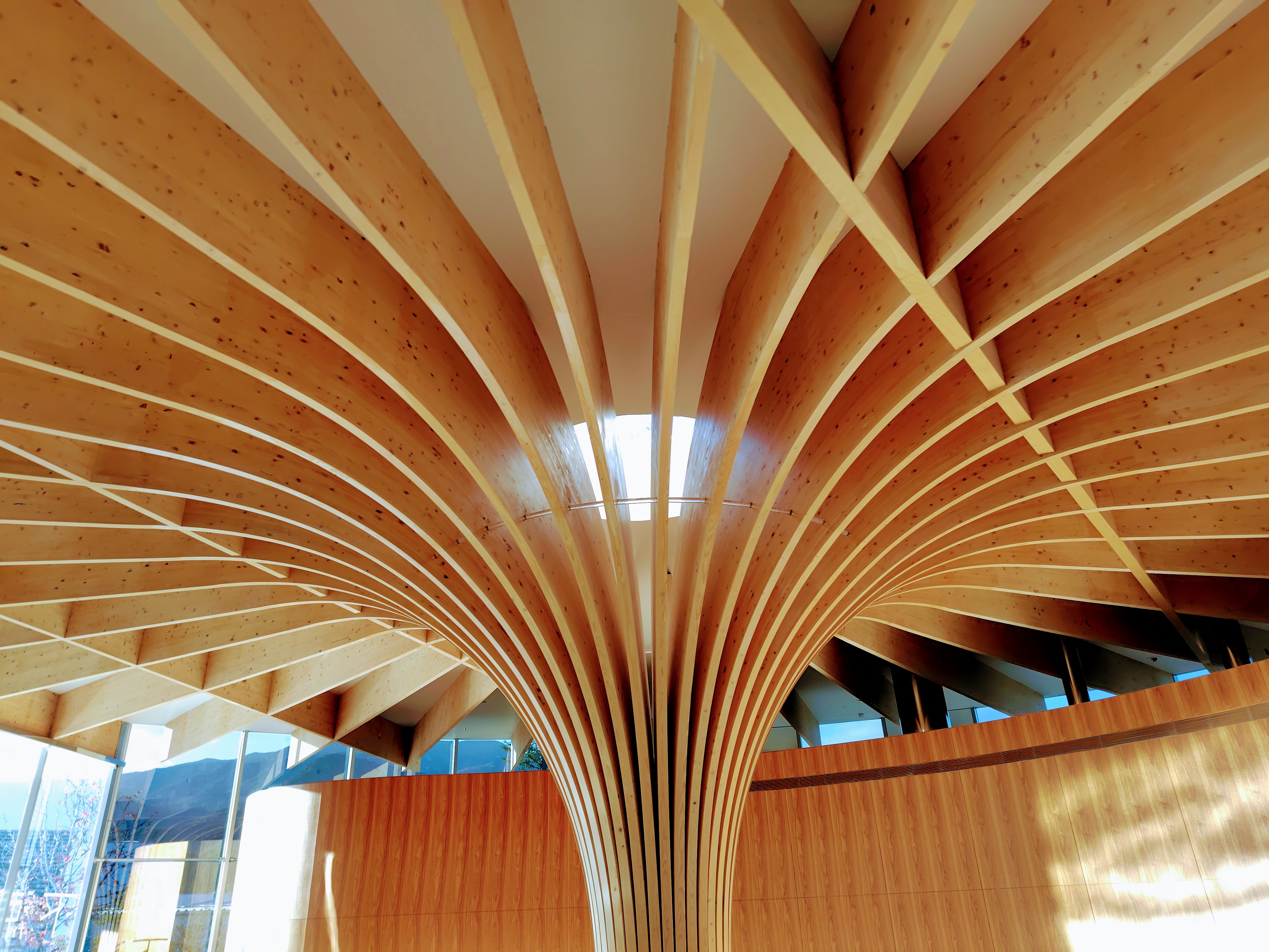 広いエントランス棟にある「桧」の集成材で作られたツリーを見ると、