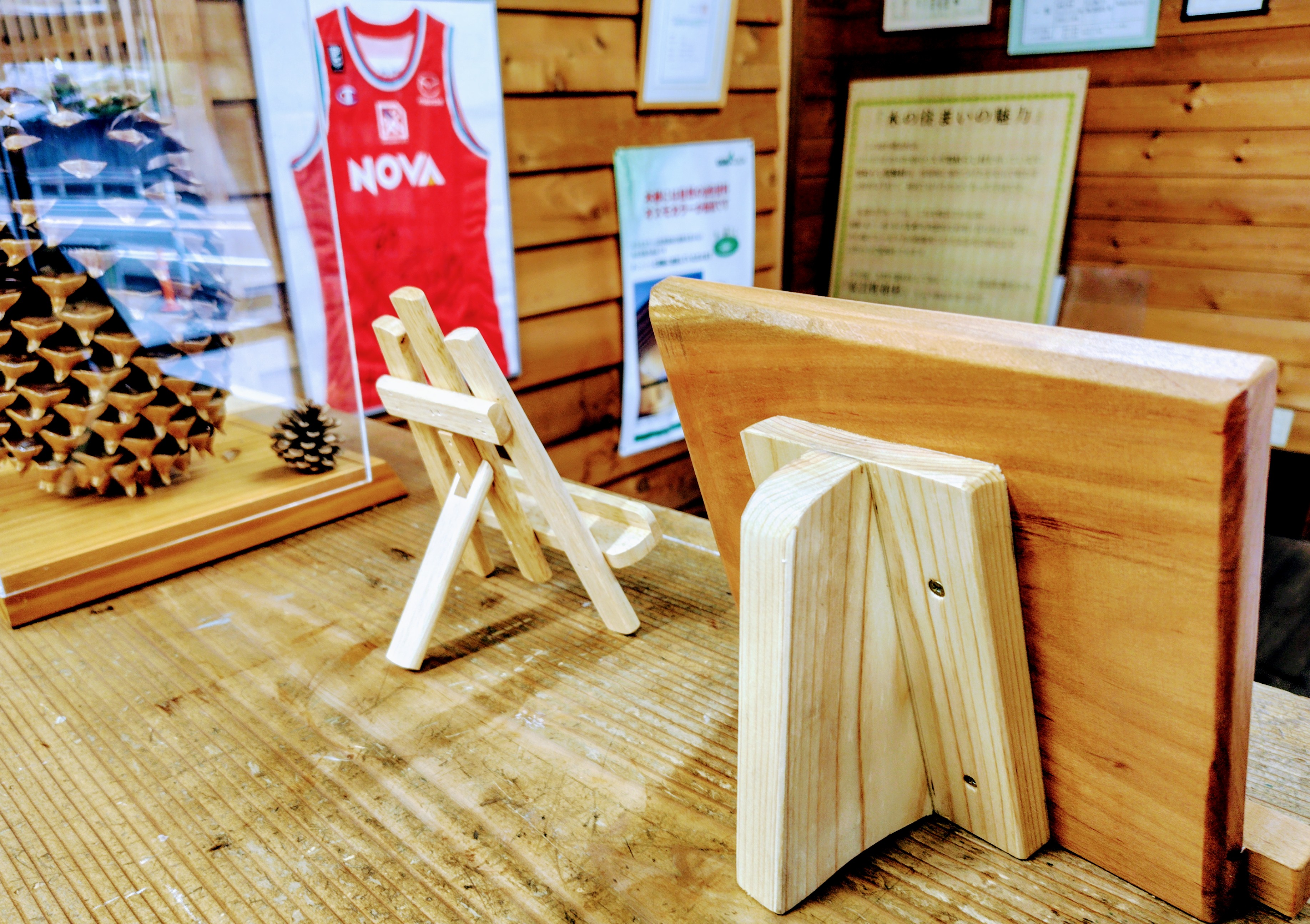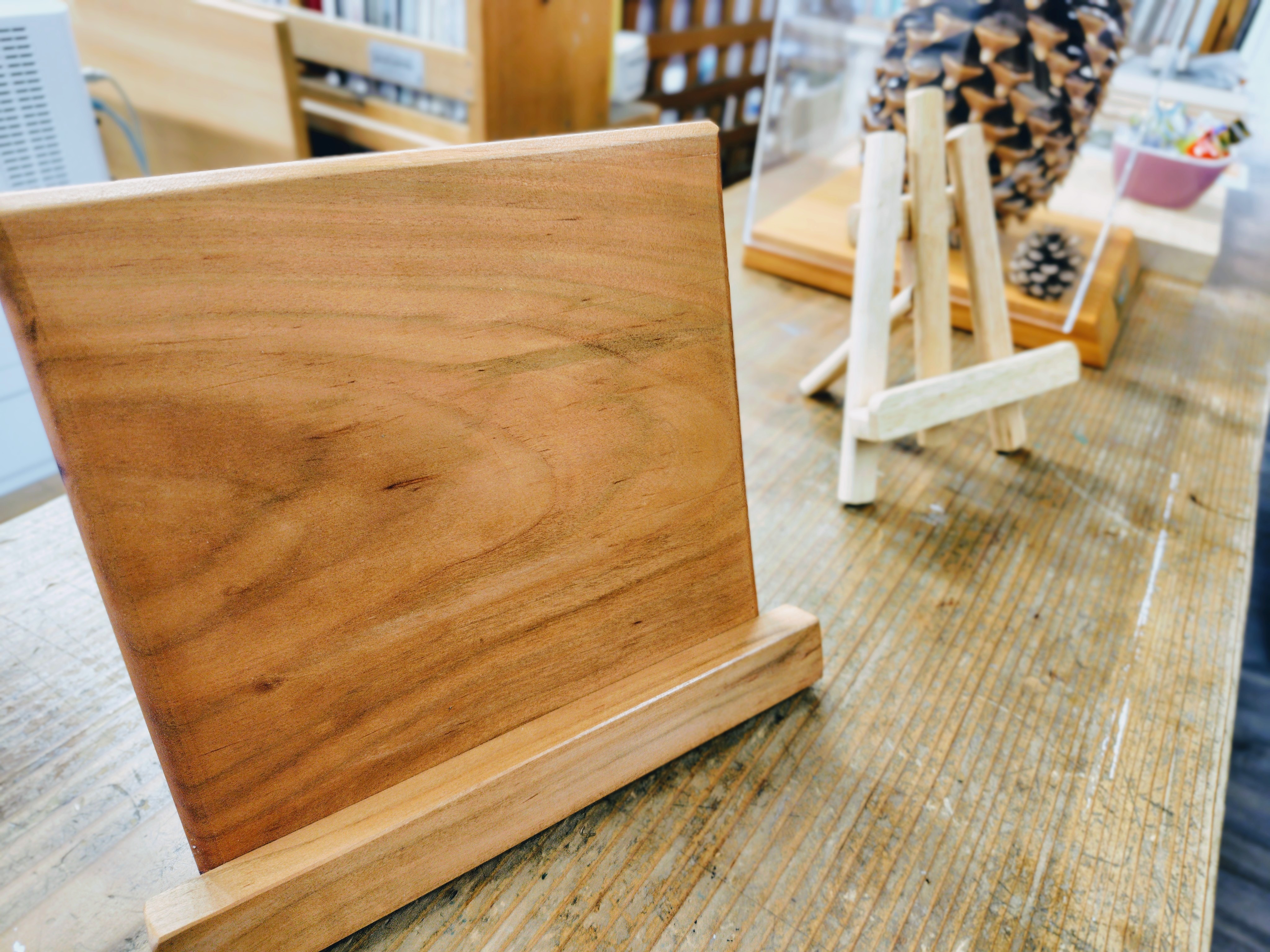 1つは既製品のスタンドで、もう1つは当社の「桜」と「桧」の端材で作ったオリジナルスタンド(○´∀`)b